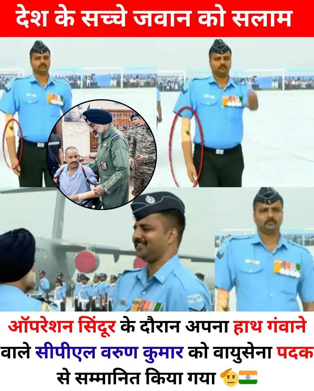 “ऑपरेशन सिंदूर” के दौरान एक हाथ खोने वाले जवान को वायु सेना पदक (Vayu Sena Medal) देकर सम्मानित किया गया — यह सम्मान वीरता और साहस के प्रतीक के रूप में याद किया जाएगा।