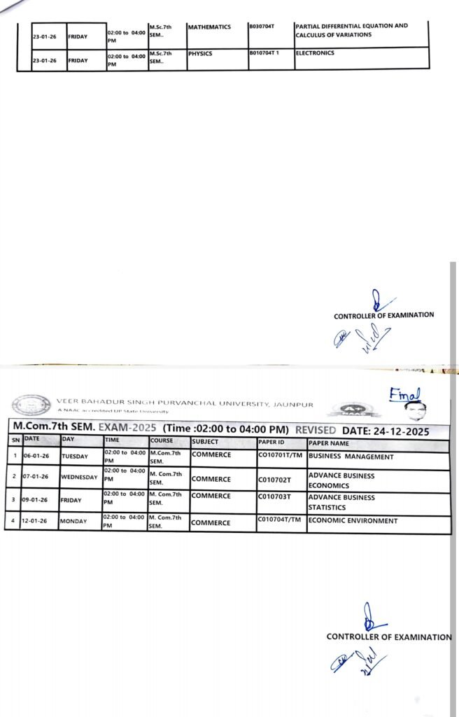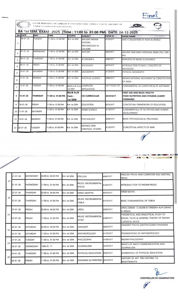 वीर बहादुर सिंह पूर्वांचल विश्वविद्यालय, जौनपुर द्वारा शैक्षणिक सत्र 2025–26 के अंतर्गत बीए प्रथम सेमेस्टर, बीएससी प्रथम सेमेस्टर, एमएससी सप्तम सेमेस्टर एवं एमकॉम सप्तम सेमेस्टर की परीक्षाओं का संशोधित (Revised) परीक्षा कार्यक्रम आधिकारिक रूप से जारी कर दिया गया है। यह संशोधित टाइम टेबल 24 दिसंबर 2025 को जारी किया गया, जिसे “Final” घोषित किया गया है।