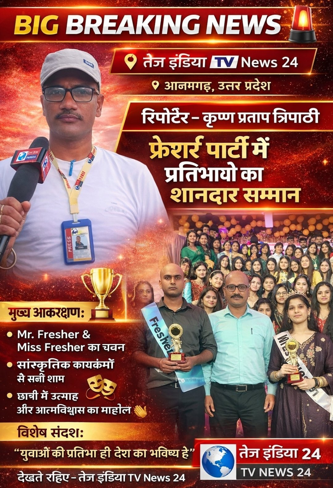 рдЖрдЬрдордЧрдврд╝ рдореЗрдВ рдЖрдпреЛрдЬрд┐рдд рдПрдХ рднрд╡реНрдп рдлреНрд░реЗрд╢рд░реНрд╕ рдкрд╛рд░реНрдЯреА рдПрд╡рдВ рд╕рдореНрдорд╛рди рд╕рдорд╛рд░реЛрд╣ рдореЗрдВ рдЫрд╛рддреНрд░реЛрдВ рдХреА рдкреНрд░рддрд┐рднрд╛ рдХреЛ рдордВрдЪ рдорд┐рд▓рд╛, рдЬрд╣рд╛рдВ рдореЗрдзрд╛рд╡реА рдЫрд╛рддреНрд░-рдЫрд╛рддреНрд░рд╛рдУрдВ рдХреЛ рдЯреНрд░реЙрдлреА рдФрд░ рд╕рдореНрдорд╛рди рдЪрд┐рдиреНрд╣ рджреЗрдХрд░ рдирд╡рд╛рдЬрд╛ рдЧрдпрд╛ред