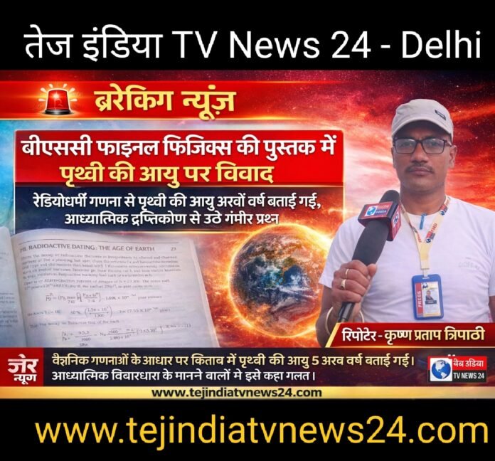 उत्तर प्रदेश समेत देश के कई विश्वविद्यालयों में पढ़ाई जा रही बीएससी फाइनल (6th सेमेस्टर) फिजिक्स की एक पुस्तक में पृथ्वी की आयु को लेकर नया विवाद खड़ा हो गया है। किताब के “Radioactive Decay: The Age of Earth” अध्याय में वैज्ञानिक गणनाओं के आधार पर पृथ्वी की आयु लगभग 5 से 5.9 अरब वर्ष बताई गई है।
